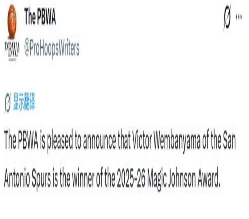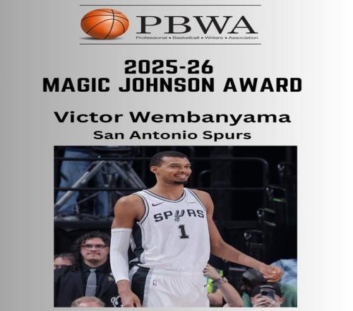 北京時間4月17日,美國職業(yè)籃球作家協(xié)會今日宣布,圣安東尼奧馬刺隊(duì)的維克托-文班亞馬斬獲2025-26賽季魔術(shù)師約翰遜獎。該獎項(xiàng)旨在表彰賽場表現(xiàn)出眾,同時在對接媒體、對待球迷時兼具配合度與優(yōu)雅風(fēng)度的NBA球員。