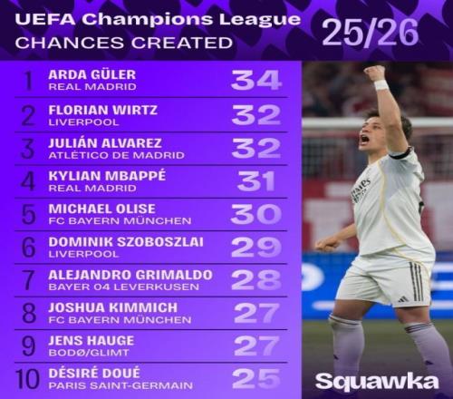 Squawka統(tǒng)計(jì)了本賽季歐冠球員創(chuàng)造機(jī)會(huì)的次數(shù),并列出榜單,居萊爾34次居首。