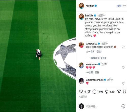 【官方公告】利物浦足球俱樂部確認(rèn),?;倏嗽庥隽藝?yán)重的跟腱傷勢(shì)。這位前鋒在周二安菲爾德對(duì)陣巴黎的歐冠比賽上半場(chǎng)因場(chǎng)地打滑摔倒,隨后被迫離場(chǎng)。后續(xù)掃描檢查確認(rèn)其跟腱斷裂。因此,埃基蒂克將缺席俱樂部賽季剩余比賽,也無(wú)法代表法國(guó)隊(duì)參加今年夏天的世界杯。俱樂部將在適當(dāng)時(shí)候發(fā)布進(jìn)一步更新,雨果將得到利物浦全體成員的全力支持。