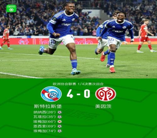 北京時間4月17日歐洲協(xié)會聯(lián)賽 1/4決賽次回合,斯特拉斯堡對陣美因茨。上半場納納西首開記錄,瓦塔拉破門擴(kuò)大領(lǐng)先優(yōu)勢,下半場巴爾科造點埃梅加主罰點球被撲出,恩西索破門再下一城,埃梅加進(jìn)球鎖定勝局。最終比分斯特拉斯堡 4-0 美因茨。兩回合總比分斯特拉斯堡4-2美因茨晉級4強(qiáng)。