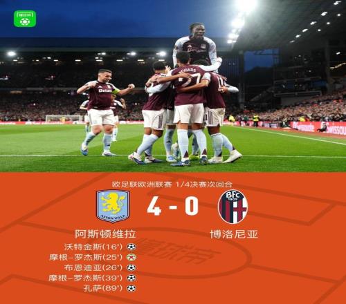 北京時間4月17日歐足聯(lián)歐洲聯(lián)賽 1/4決賽次回合,阿斯頓維拉對陣博洛尼亞。上半場沃特金斯首開記錄,羅杰斯失點,布恩迪亞破門再下一城,羅杰斯將功補過破門擴大比分。下半場孔薩破門鎖定勝局。最終比分阿斯頓維拉 4-0 博洛尼亞。兩回合總比分阿斯頓維拉7-1博洛尼亞晉級。