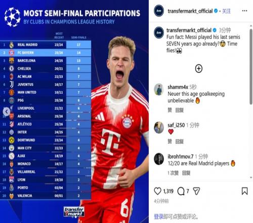 根據(jù)德轉(zhuǎn)的數(shù)據(jù)統(tǒng)計(jì),這是拜仁歷史上第14次挺進(jìn)歐冠四強(qiáng),排在第二位,僅次于17次進(jìn)入四強(qiáng)的皇馬。