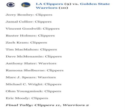 而在比賽開打前,ESPN專家團對本場比賽結(jié)果進行預(yù)測,最終11人預(yù)測快船獲勝,僅2人預(yù)測勇士獲勝。