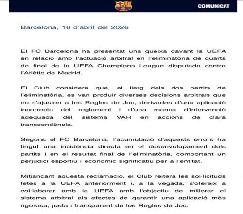 歐冠八強(qiáng)戰(zhàn)剛結(jié)束,巴薩官方突然向歐足聯(lián)提交正式投訴。矛頭直指對陣馬競兩回合的裁判執(zhí)法——這不是普通的賽后抱怨,而是一次有備而來的規(guī)則博弈。