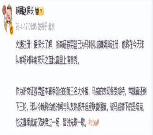北京時(shí)間4月17日消息,浙江廣廈客場(chǎng)負(fù)于山西男籃后,主教練王博因情緒失控沖入場(chǎng)內(nèi)被驅(qū)逐,球隊(duì)近期接連受挫,士氣遭遇嚴(yán)峻考驗(yàn)。為補(bǔ)強(qiáng)內(nèi)線短板,廣廈官方正式宣布簽下身高2米13、臂展出眾且具備三分投射能力的大外援馬利克·威姆斯,其大概率將取代表現(xiàn)低迷的卡爾頓,于4月17日19:30客場(chǎng)對(duì)陣南京同曦的比賽中迎來(lái)CBA首秀。