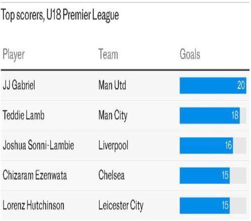 最終,加布里埃爾梅開二度,幫助曼聯(lián)5-0大勝米堡。從此,他的進(jìn)球勢(shì)頭就沒有停止過。上周六,曼聯(lián)U18以2-0完勝利茲聯(lián)青年隊(duì),他也攻入一球,排名英超U18聯(lián)賽射手榜第一,力壓一眾年齡比他更大的對(duì)手。