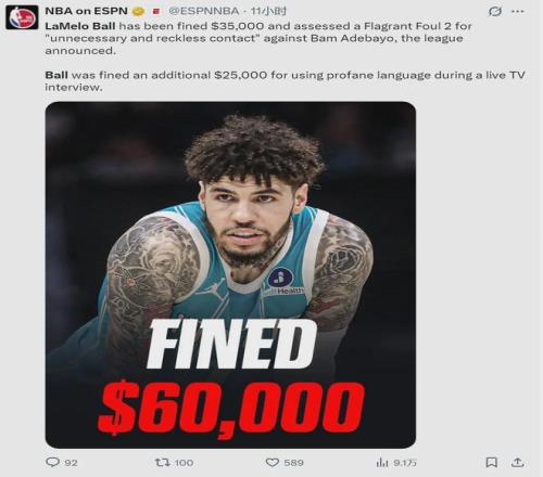 NBA官方宣布:黃蜂球員拉梅洛-鮑爾因為拉拽阿德巴約,被聯(lián)盟罰款3.5萬美元,同時追加一個二級惡意犯規(guī)。此外,拉梅洛-鮑爾在賽后采訪時說臟話被罰款2.5萬美元。也就是說,三球一共被罰款6萬美元,并沒有被禁賽。