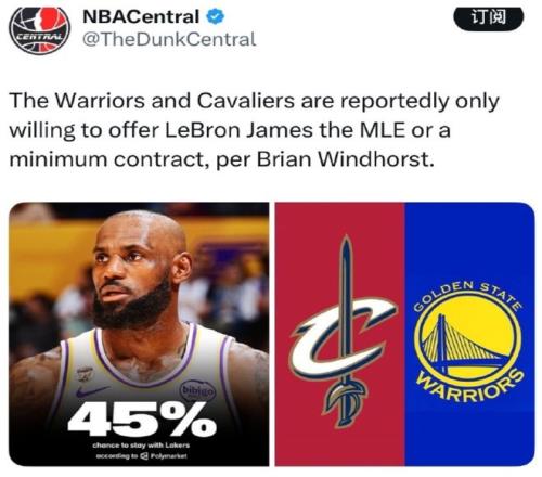 今天NBA休戰(zhàn)一天,一些搞笑的消息傳出了。據(jù)NBA記者布萊恩·溫霍斯特報(bào)道,按照此前的消息,如果詹姆斯下賽季不留在湖人,那么勇士和騎士等球隊(duì)會(huì)進(jìn)入他的考慮范圍內(nèi),而在最 新的消息里,勇士和騎士?jī)H僅愿意給詹姆斯提供中產(chǎn)特例或者老將底薪。