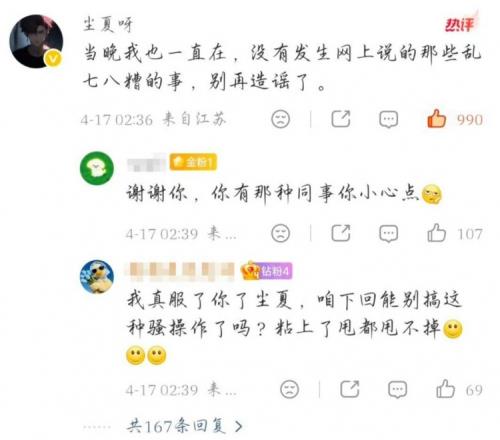 在清清和狼隊官方運(yùn)營相繼發(fā)文回應(yīng)后,Hero久競的塵夏在評論區(qū)為清清辟謠:當(dāng)晚我也一直在,沒有發(fā)生網(wǎng)上說的那些亂七八糟的事,別再造謠了。