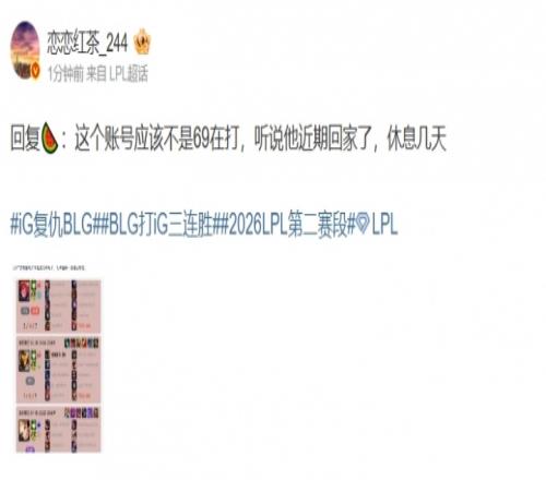 對此,今日爆料人“戀戀紅茶”更博透露:這個賬號應(yīng)該不是69在打,聽說他近期回家了,休息幾天。