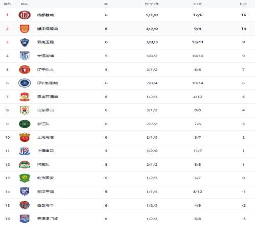 在積分榜上,成都蓉城高居榜首,拿到16分。重慶銅梁龍這匹黑馬4勝2平,拿到14分,排名第2。前2差距只有2分,榜首之爭非常激烈。云南玉昆和大連英博都是9分,排名第3和第4名。山東泰山4分,排名第8。上海海港2勝1平3負(fù),拿到2分,排名第10。上海申花3勝2平,總積分是1分,排名第11。北京國安1勝2平3負(fù),總積分是0分,排名第13。