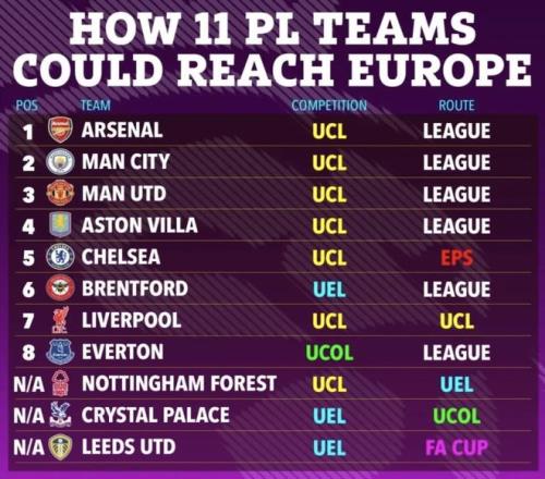 最近英國(guó)媒體《太陽(yáng)報(bào)》的“11支英超球隊(duì)都有機(jī)會(huì)進(jìn)歐戰(zhàn)”的分析圖火了。結(jié)合現(xiàn)在的真實(shí)積分榜一看,這真不是在博眼球。你看目前的聯(lián)賽排名:阿森納70分穩(wěn)居第一,曼城少賽一場(chǎng)拿了61分排第二,曼聯(lián)55分第三,維拉54分第四。緊接著就是49分的利物浦排第五,切爾西48分排第六,布倫特福德和埃弗頓都是46分。再加上英超官方已經(jīng)基本確認(rèn)能拿到一個(gè)額外的歐冠名額,下賽季聯(lián)賽前五名大概率都能踢歐冠。這條線一拉長(zhǎng),后面的球隊(duì)全都有了盼頭。(數(shù)據(jù)截至北京時(shí)間2026年4月10日)