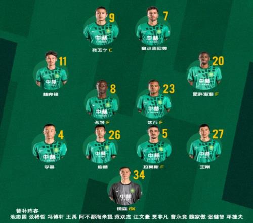 本場比賽,北京國安在首發(fā)上派出34-侯森、4-李磊、5-拉莫斯、26-柏楊、27-王剛、7-塞爾吉尼奧、8-孔特、20-恩科洛洛、23-達(dá)萬、9-張玉寧、11-林良銘的陣容。