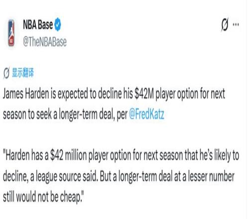 北京時間4月17日,據(jù)The Athletic(TA)報道,聯(lián)盟消息人士透露:哈登下賽季擁有4200萬美元球員選項,他大概率會選擇跳出。即便后續(xù)簽下一份年薪更低的長期合同,薪資總價依舊不菲。