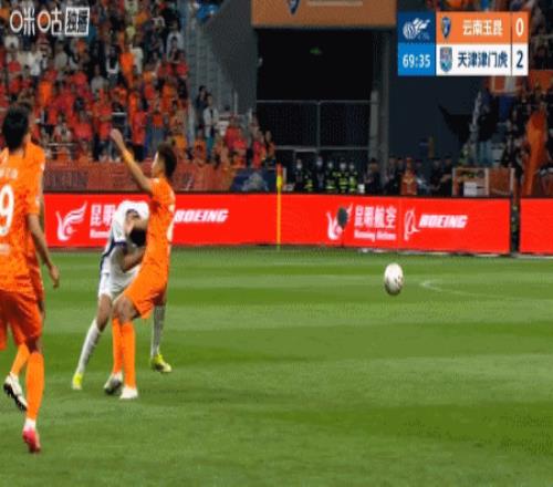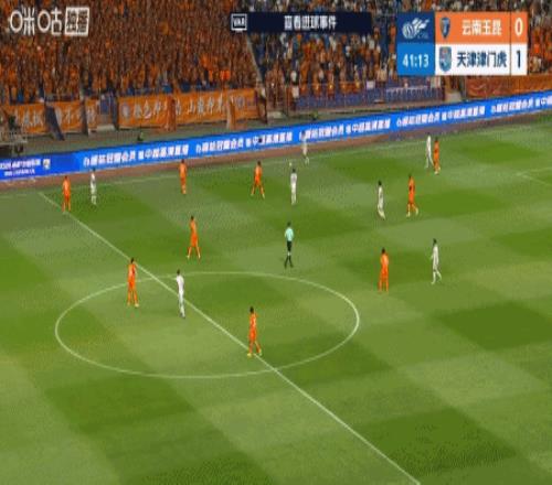 第41分鐘,王政豪長(zhǎng)傳找身后,基萊斯中場(chǎng)插上破門,津門虎1-0云南!