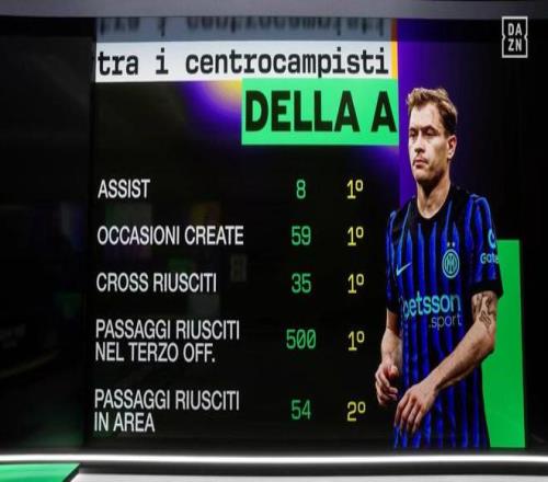 根據(jù)DAZN的統(tǒng)計(jì),巴雷拉本賽季在意甲8次助攻、創(chuàng)造59次機(jī)會(huì)、完成35次成功傳中以及完成500次進(jìn)攻三區(qū)內(nèi)的傳球均位列聯(lián)賽同期所有中場(chǎng)球員的第一位。此外,巴雷拉還有54次傳至禁區(qū)內(nèi)的成功傳球,這位列聯(lián)賽同期所有中場(chǎng)的第二位。