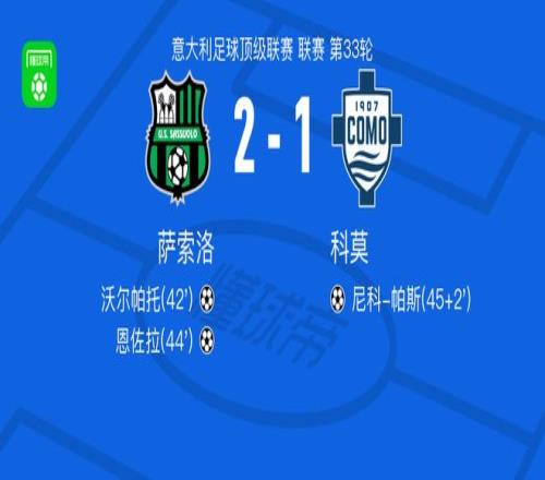 北京時(shí)間4月18日意大利足球頂級(jí)聯(lián)賽 聯(lián)賽 第33輪,薩索洛主場對(duì)陣科莫。薩索洛沃爾帕托破門,恩佐拉破門。科莫尼科-帕斯破門。最終比分薩索洛 2-1 科莫。