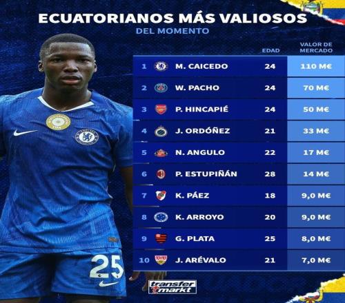 北京時間4月18日,在莫伊塞斯-凱塞多與切爾西續(xù)約到2033年之后,德轉(zhuǎn)列出了目前厄瓜多爾球員身價前10,凱塞多以1.1億歐元高居第一,威廉-帕喬7000萬歐元第二,因卡皮耶5000萬歐元第三。