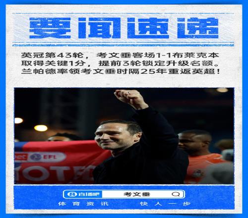 體育播報04月18日宣 英冠第43輪,考文垂客場1-1布萊克本,球隊提前3輪鎖定英冠前兩名,成功獲得下賽季英超參賽資格,時隔25年重返英超。