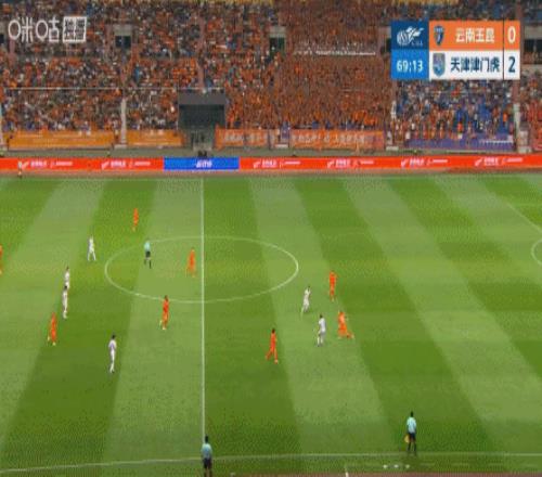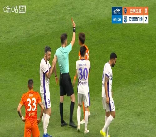 體育播報04月17日宣 中超第6輪,云南玉昆vs天津津門虎,比賽第70分鐘,張宸梁身后拉倒謝蒂內(nèi),兩黃變一紅被罰下,玉昆0-2+少一人作戰(zhàn)!VAR介入檢查是否構(gòu)成直紅,最后維持黃牌判罰。