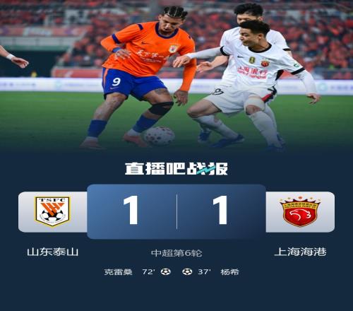 體育播報4月17日宣 北京時間19:35,中超第6輪山東泰山vs上海海港,比賽在濟南奧體中心體育場打響!上半場,謝文能兜射破門被吹越位;李帥助攻楊希破門!下半場,克雷桑小角度神仙任意球扳平!澤卡低射中柱!