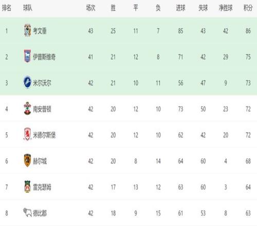 在考文垂確保升級(jí)之后,本賽季英冠還有2個(gè)升級(jí)名額,其中排名第二的伊普斯維奇,目前比米爾沃爾少賽1場(chǎng),而且還領(lǐng)先2分,他們有機(jī)會(huì)鎖定前二,直接升級(jí)。至于排名第三到第六的球隊(duì),則進(jìn)行附加賽,決出最后一個(gè)升級(jí)名額,最終的結(jié)果如何,我們拭目以待!