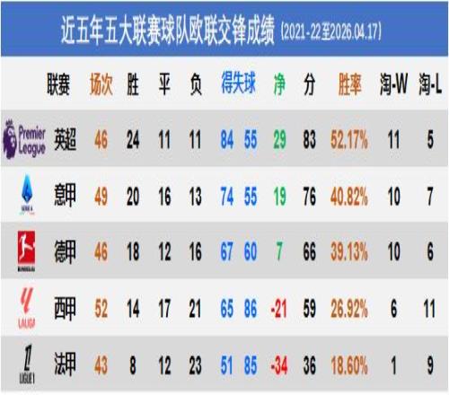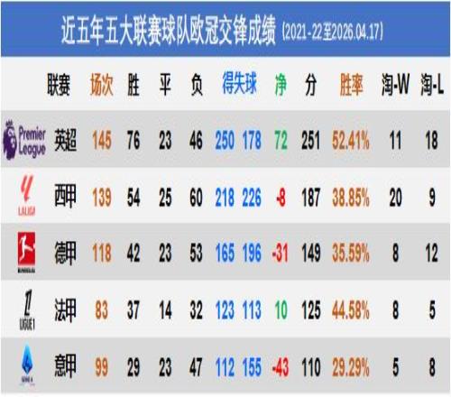 對英超勝負處于劣勢,但淘汰賽暫時領(lǐng)先;對西甲勝負持平,但淘汰賽一敗涂地;對德甲、法甲占據(jù)明顯優(yōu)勢。