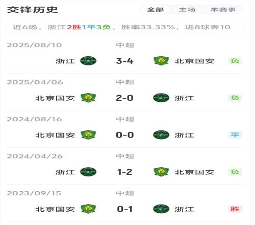 目前,浙江隊(duì)2勝1平2負(fù)目前2分,北京國(guó)安1勝1平3負(fù)目前-1分。