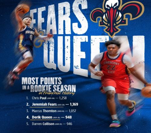 體育播報4月18日宣 鵜鶘官方社媒發(fā)布一組數(shù)據(jù),費爾斯(1169分)和奎因(948分)作為新秀,單賽季總得分可以排在隊史新秀總得分榜的第二和第四位。