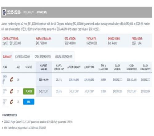 哈登在去年夏天跟快船簽下一份兩年8150萬(wàn)的合同,本賽季薪水3944萬(wàn),下賽季薪水4231萬(wàn)(球員選項(xiàng)),本賽季他被交易到騎士時(shí)放棄了合同中15%的交易保證金,他加盟騎士隊(duì)就是為了競(jìng)爭(zhēng)總冠軍,而他的老東家快船已經(jīng)無(wú)緣季后賽。