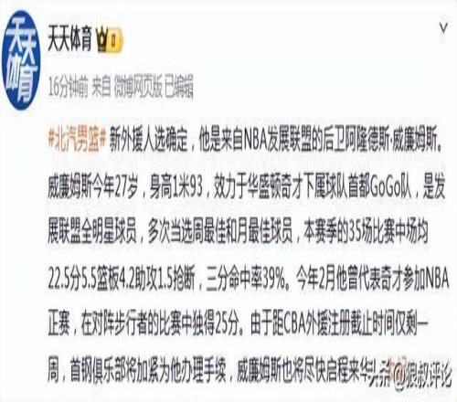 今年2月他曾代表奇才參加NBA正賽,在對陣步行者的比賽中獨得25分。由于距CBA外援注冊截止時間僅剩一周,首鋼俱樂部將加緊為他辦理手續(xù),威廉姆斯也將盡快啟程來華。