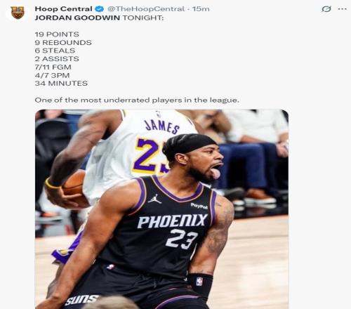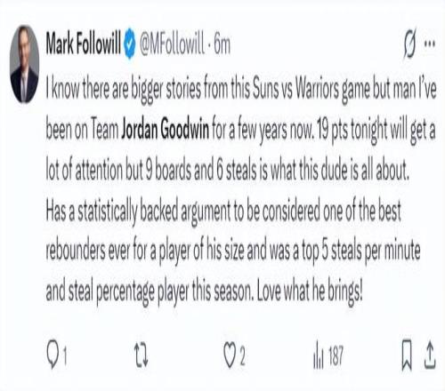 太陽(yáng)記者:老實(shí)說(shuō)我支持古德溫已經(jīng)好幾年了,他拿到19+9+6搶斷非常出色,在同體型的球員中他是聯(lián)盟最出色的籃板手之一,本賽季他的搶斷次數(shù)聯(lián)盟前五。