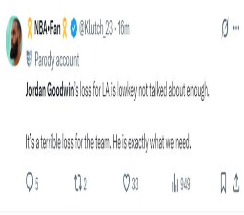 湖人媒體:古德溫的離開(kāi)對(duì)于LAL來(lái)說(shuō)很慘烈,他的離隊(duì)不該沒(méi)人提及,他對(duì)于我們來(lái)說(shuō)是巨大的損失,我們很需要他這樣的球員。(2025年7月湖人為了簽下斯馬特裁掉了古德溫,隨后太陽(yáng)認(rèn)領(lǐng)了古德溫)