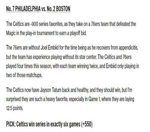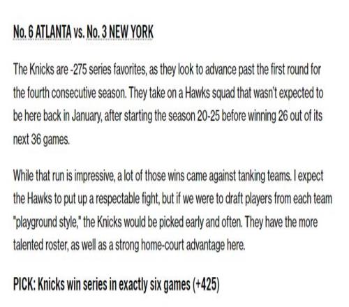 東部季后賽首輪:活塞VS魔術(shù)、凱爾特人VS76人、尼克斯VS老鷹、騎士VS猛龍。隨后美國媒體FOX體育對(duì)東部季后賽首輪的晉級(jí)形勢(shì)進(jìn)行了預(yù)測(cè)。