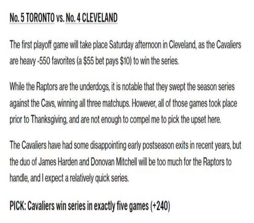 猛龍VS騎士的首輪,美媒是預(yù)測(cè)騎士4-1淘汰猛龍晉級(jí)次輪,雖然常規(guī)賽猛龍是三殺騎士隊(duì),可季后賽不是常規(guī)賽,當(dāng)哈登、米切爾、莫布利、阿倫四巨頭都健康時(shí)騎士隊(duì)的攻防都是壓制猛龍的存在。
