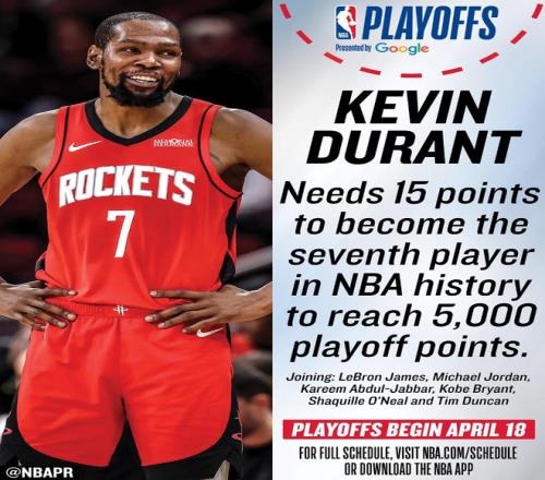 杜蘭特差15分解鎖5000分,季后賽歷史第七人