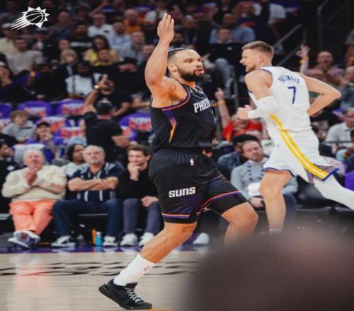 半場(chǎng)戰(zhàn)罷,太陽(yáng)50-45領(lǐng)先勇士5分。波杰姆斯基12分5板,得分全隊(duì)最高,庫(kù)里6中2得到7分4板3助2斷。太陽(yáng)杰倫-格林14分3板2助2帽、布克9分3板3助、古德溫6分5板4斷。第三節(jié)剛開(kāi)始,布克4犯了,狄龍和杰倫-格林外線(xiàn)開(kāi)炮。