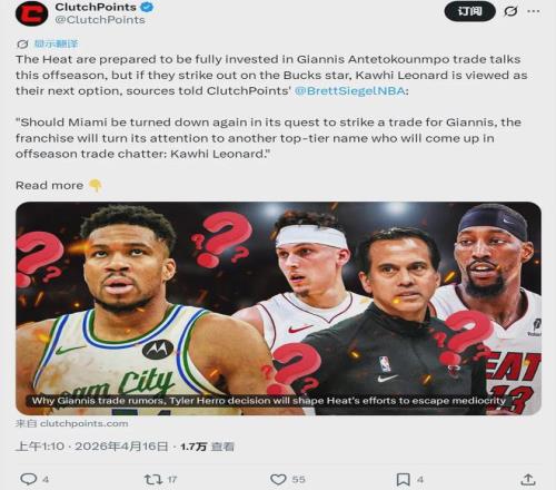 如果熱火追不到字母哥,倫納德將成為他們的下一個(gè)目標(biāo)。本賽季熱火43勝39負(fù)排名東部第10,附加賽被黃蜂淘汰出局,最終無緣季后賽。此前6個(gè)賽季熱火均打進(jìn)季后賽,今年這一紀(jì)錄中斷了。如果保持現(xiàn)狀,熱火依然沒有競爭力!