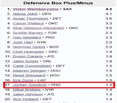 也就是說,古德溫在場(chǎng)時(shí),太陽防守接近聯(lián)盟前五水平,而當(dāng)古德溫不在場(chǎng)時(shí),太陽防守就直接掉到中下游了;而這還只是一名角色球員交出來的價(jià)值,堪稱優(yōu)質(zhì)。