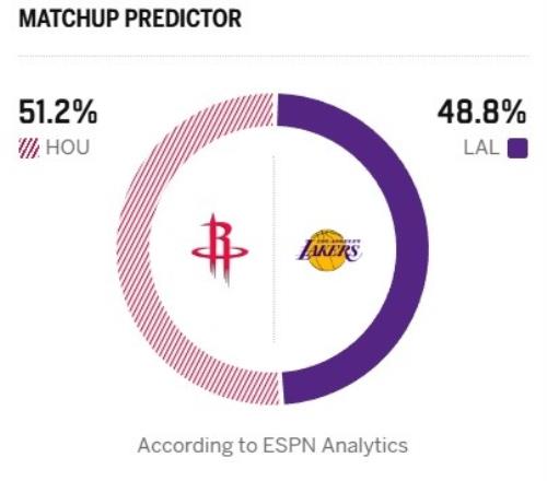 今日ESPN給出本場(chǎng)勝率預(yù)測(cè),火箭51.2%稍占上風(fēng),湖人為48.8%。