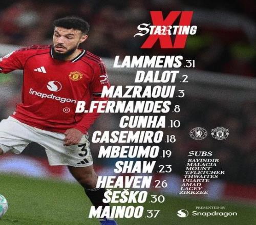 曼聯(lián)首發(fā):31-拉門斯、2-達洛特、3-馬茲拉維、26-海文、23-盧克-肖、37-梅努、18-卡塞米羅、8-B費、10-庫尼亞、30-謝什科、19-姆伯莫