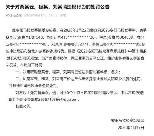 新京報訊 4月17日,河南安陽馬拉松賽組委會發(fā)布處罰公告:經(jīng)安陽馬拉松賽組委會核查,在2026年3月22日舉辦的2026安陽馬拉松賽中,選手桑某云(參賽號D81548,身份證號410*************26)、程某(參賽號D84639,身份證號410*************48)、劉某清(參賽號D82371,身份證號410*************85)存在轉(zhuǎn)讓號碼布給他人參賽的違規(guī)行為。根據(jù)《2026安陽馬拉松賽競賽規(guī)程》中第十四條“處罰辦法”相關(guān)規(guī)定,為嚴(yán)肅賽場紀(jì)律,保證賽事的公平公正,維護全體參賽選手的合法權(quán)益,作出如下處罰: