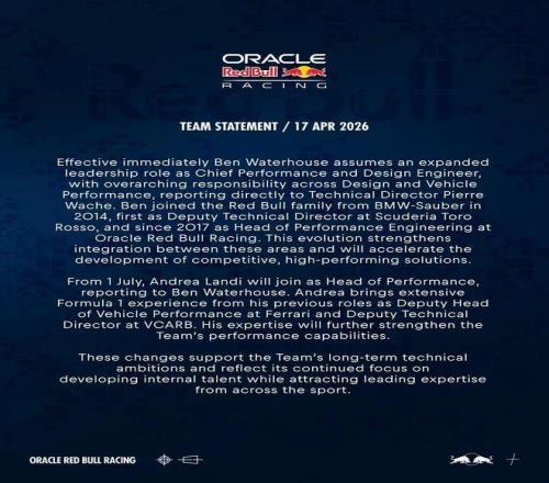 與此同時,曾擔任法拉利車輛性能副主管的安德烈亞·蘭迪將于2026年7月1日起正式加盟紅牛車隊,擔任性能主管,直接向沃特豪斯匯報。