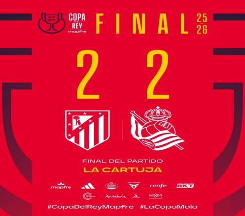 體育播報(bào)4月19日宣 北京時(shí)間4月19日3:00,2025/26賽季國王杯決賽,馬德里競技在中立場地塞維利亞奧林匹克體育場迎戰(zhàn)皇家社會。上半場,巴雷內(nèi)切亞開場15秒閃擊破門,盧克曼扳平比分,奧亞薩瓦爾點(diǎn)射得手;下半場,替補(bǔ)出場的阿爾馬達(dá)助攻阿爾瓦雷斯爆射扳平。90分鐘常規(guī)時(shí)間結(jié)束,兩隊(duì)進(jìn)入加時(shí)賽。