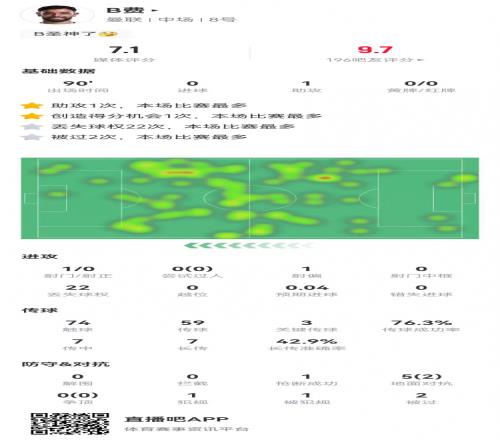 B費(fèi)本場(chǎng)1射0正+1助攻3關(guān)鍵傳球+22丟失球權(quán)獲評(píng)7.1分