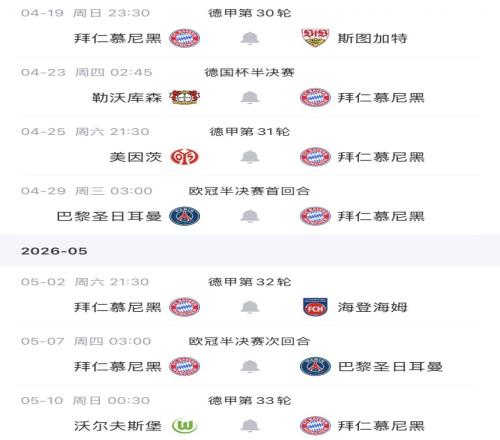 拜仁今晚將主場(chǎng)迎戰(zhàn)斯圖加特,不敗即可提前鎖定德甲冠軍。4月29號(hào),拜仁將在歐冠半決賽首回合客戰(zhàn)巴黎。