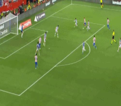 第32分鐘,科克長傳打到左路,盧克曼突破傳中,格列茲曼包抄射門踢疵摔倒,浪費一次破門良機。