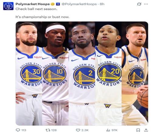 美媒PolyMarket Hoops曬出庫里、巴特勒、倫納德、霍福德、波爾津吉斯的陣容寫道,要么沖擊總冠軍,要么一無所有。