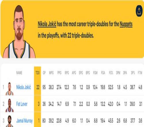 2.約基奇季后賽生涯第22次三雙,繼續(xù)刷新隊(duì)史第一紀(jì)錄;