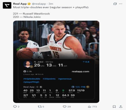 4.約基奇常規(guī)賽+季后賽三雙合計(jì)已經(jīng)達(dá)到220大關(guān),距離威少只差1次;